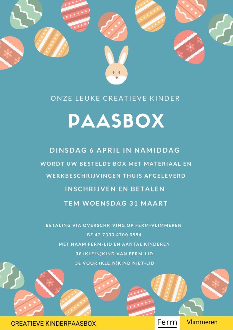 Onze kindernamiddag op woensdag 14 april kan nog niet doorgaan, maar we hebben een leuk alternatief. We gaan weer werken met een heuse leuke creatieve paasbox , waar al het materiaal en werkbeschrijving in zal zitten. (zoals de halloweenbox) Deze wordt geleverd dinsdag 6 april in de namiddag.